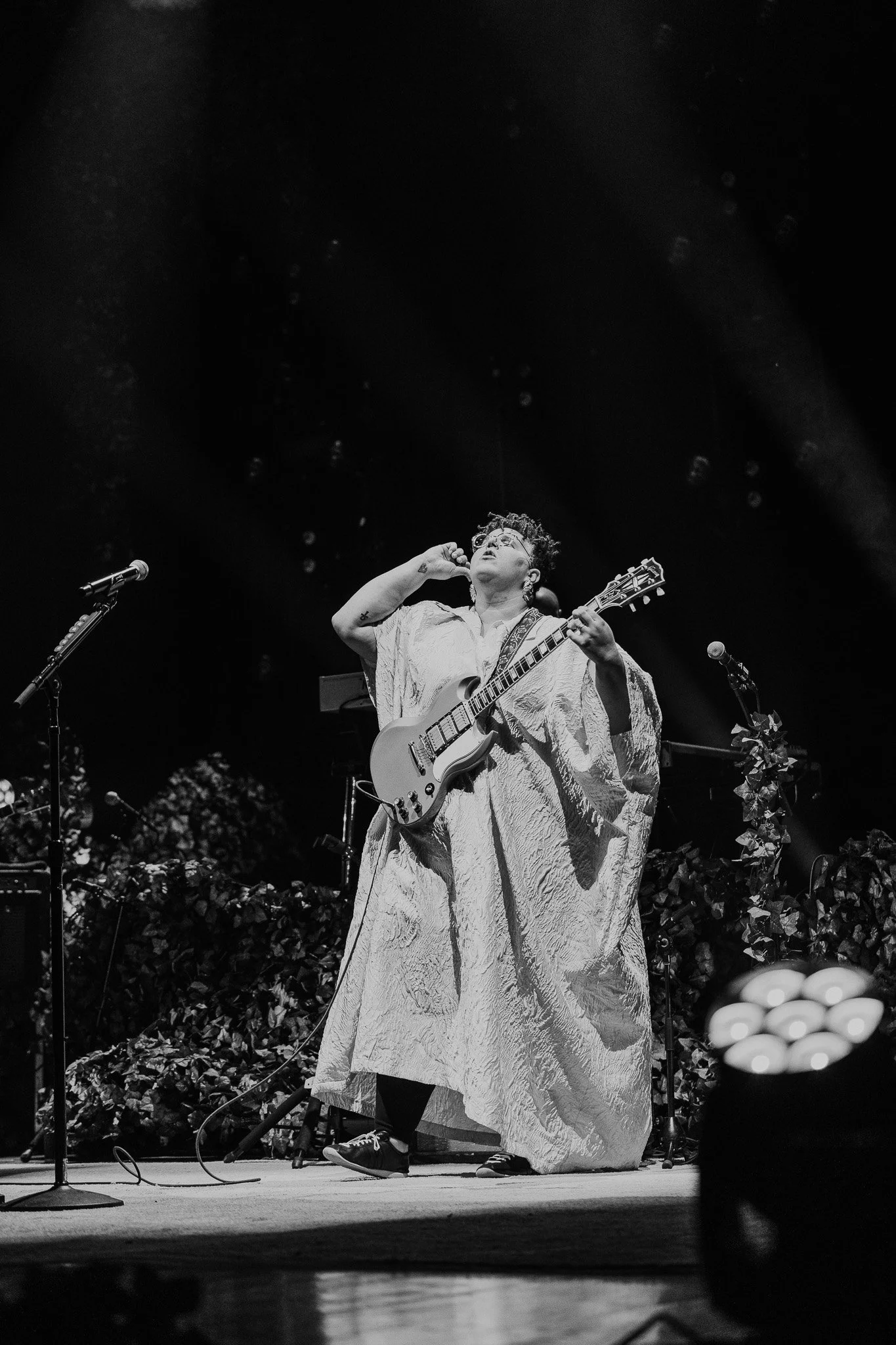As anticipation built, Alabama Shakes took the stage to Creedence Clearwater Revival’s “Run Through the Jungle,” a fitting choice given their lush, jungle-inspired stage design with ivy and flowers wrapped around the instruments and lighting rigs, creating a moody, immersive atmosphere. They launched straight into “Hang Loose” to start the show, immediately reminding everyone of the raw power of Brittany Howard’s vocals. Her soulful, commanding, and electric voice cut through the night air, while the band delivered a tight, energetic performance that kept the crowd moving.