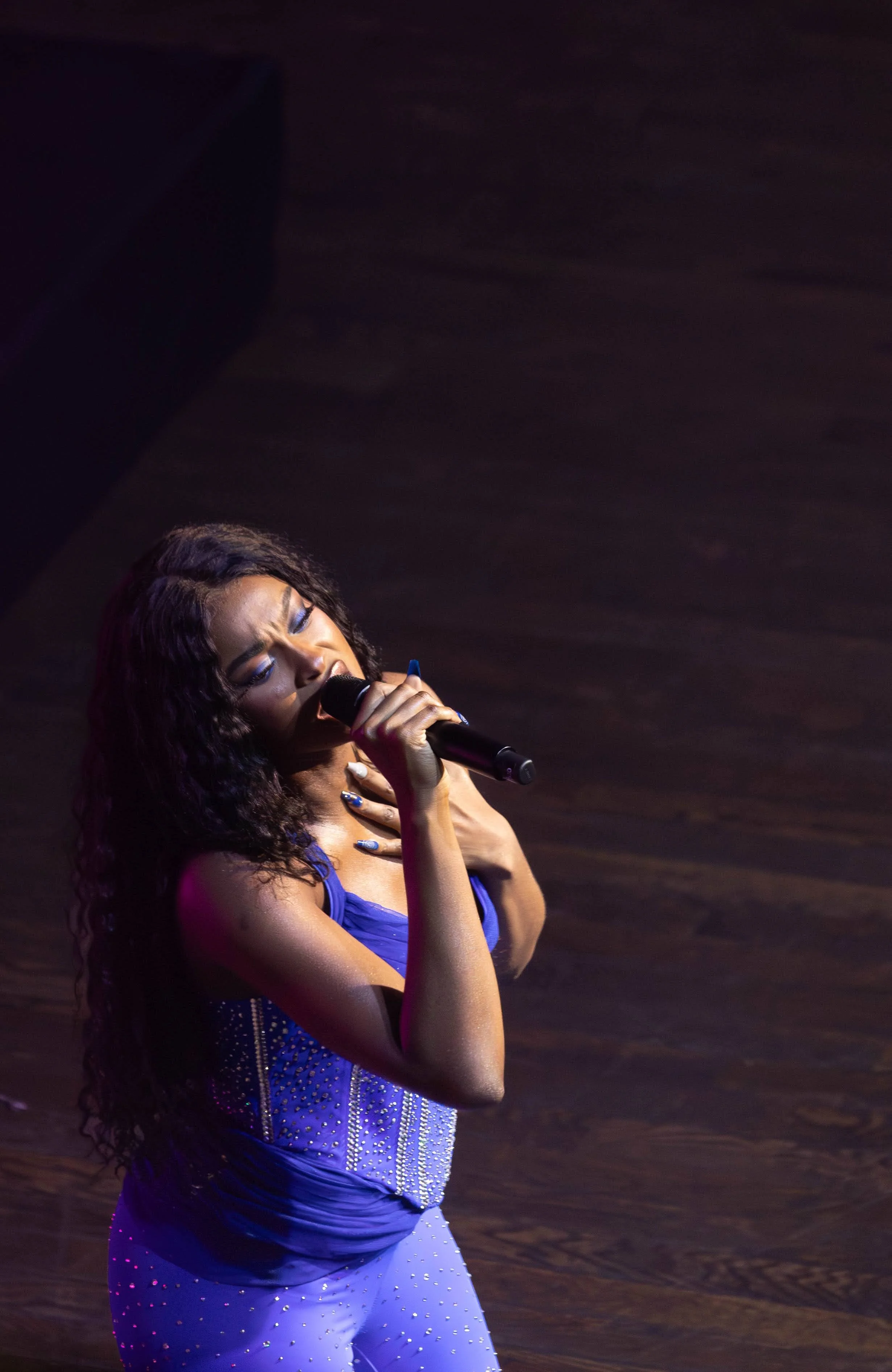 Wearing royal purple, Coco glided through a setlist that showcased both the strength and softness of her artistry. She performed crowd favorites like “Caliber,” “No Chaser,” “Double Back,” and the Grammy-winning hit “ICU.” She took her time, delivering every line with depth and ease. At one point, she sat down to simply sing, no frills, no distractions, just her voice filling the room like church. Her cover of “There Goes My Baby” was a standout moment that left the crowd in awe.