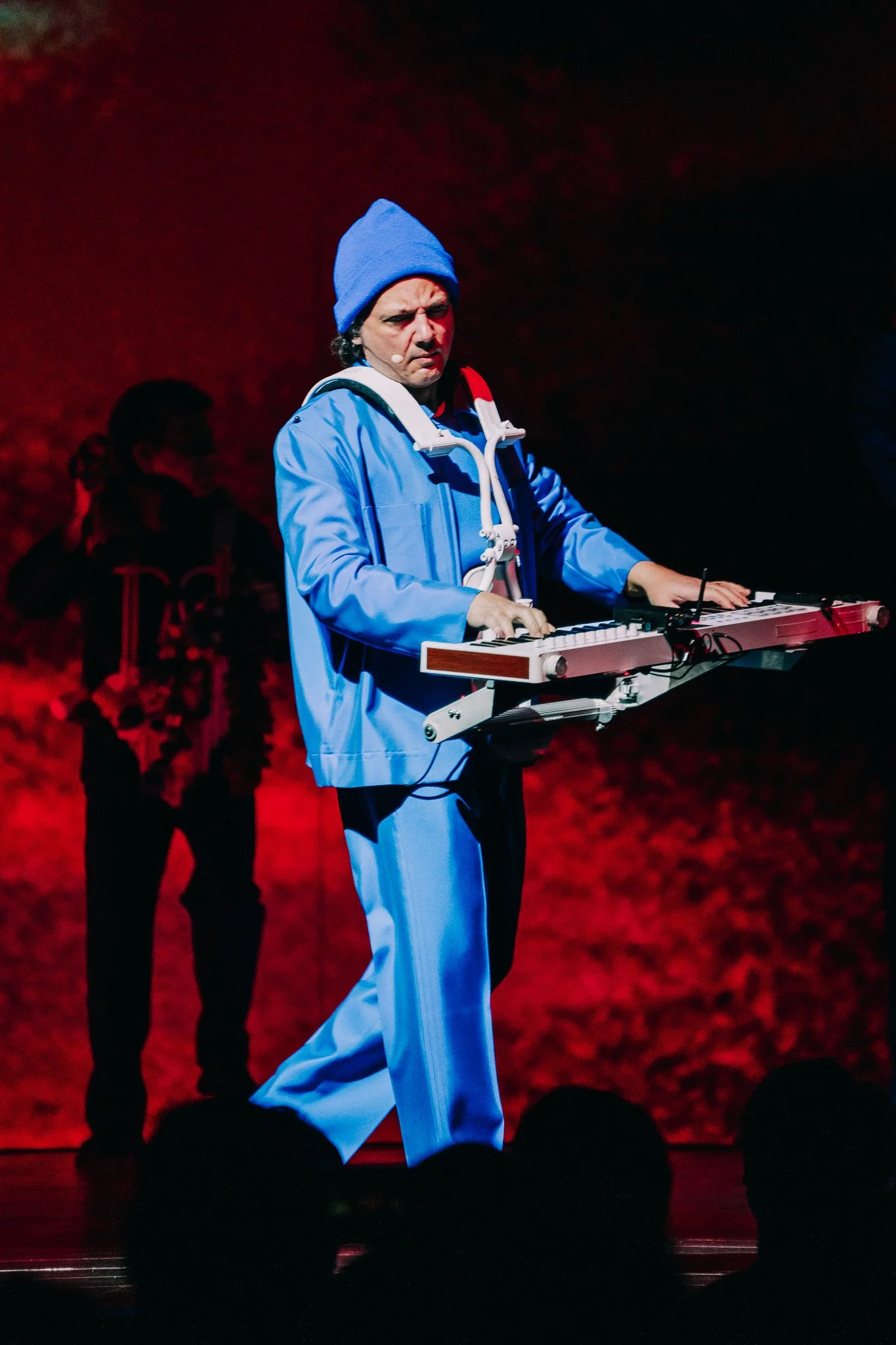In a fun twist, he followed up with a cover of Paramore’s "Hard Times," adding his own quirky spin. Then, with a long, eerie intro, the lighting cast a dramatic shadow on stage; evoking a Norman Bates-like atmosphere, as Byrne launched into the iconic "Psycho Killer," arguably the most famous Talking Heads song.